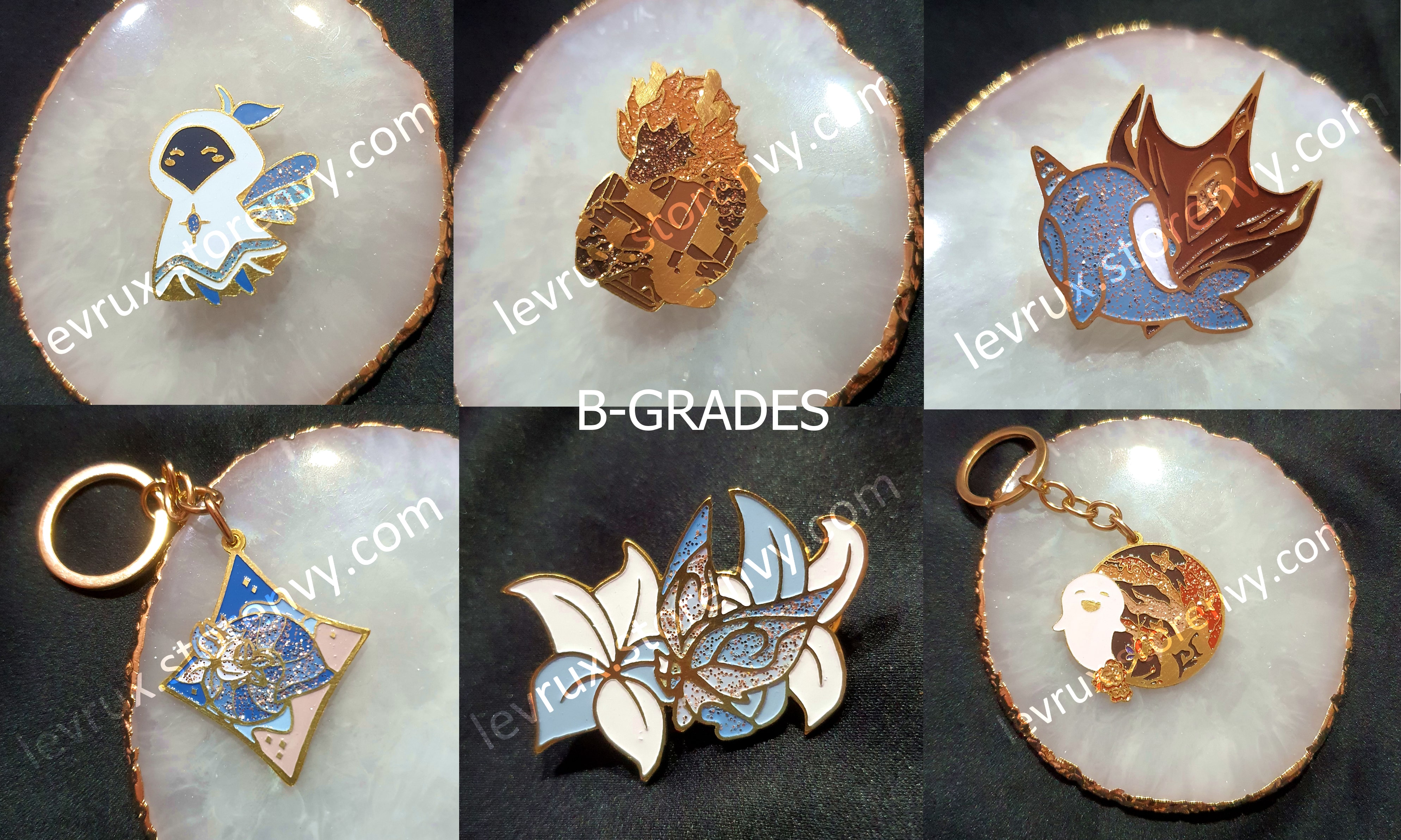 Genshin Impact B-grade enamel pins & samples. Imperfections/different than final design/etc